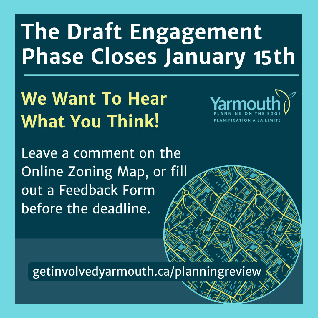Thank you to everyone who has taken the time to submit feedback on the Draft Municipal Planning Strategy & Land Use Bylaw over the past two months. Haven't had your say yet? There's still time to get your comments in using the Online Zoning Map or Feedback Form on the project website! The Draft Engagement Phase closes on January 15th, 2026. To learn more and submit your feedback, please visit the project website at: https://getinvolvedyarmouth.ca/planningreview
